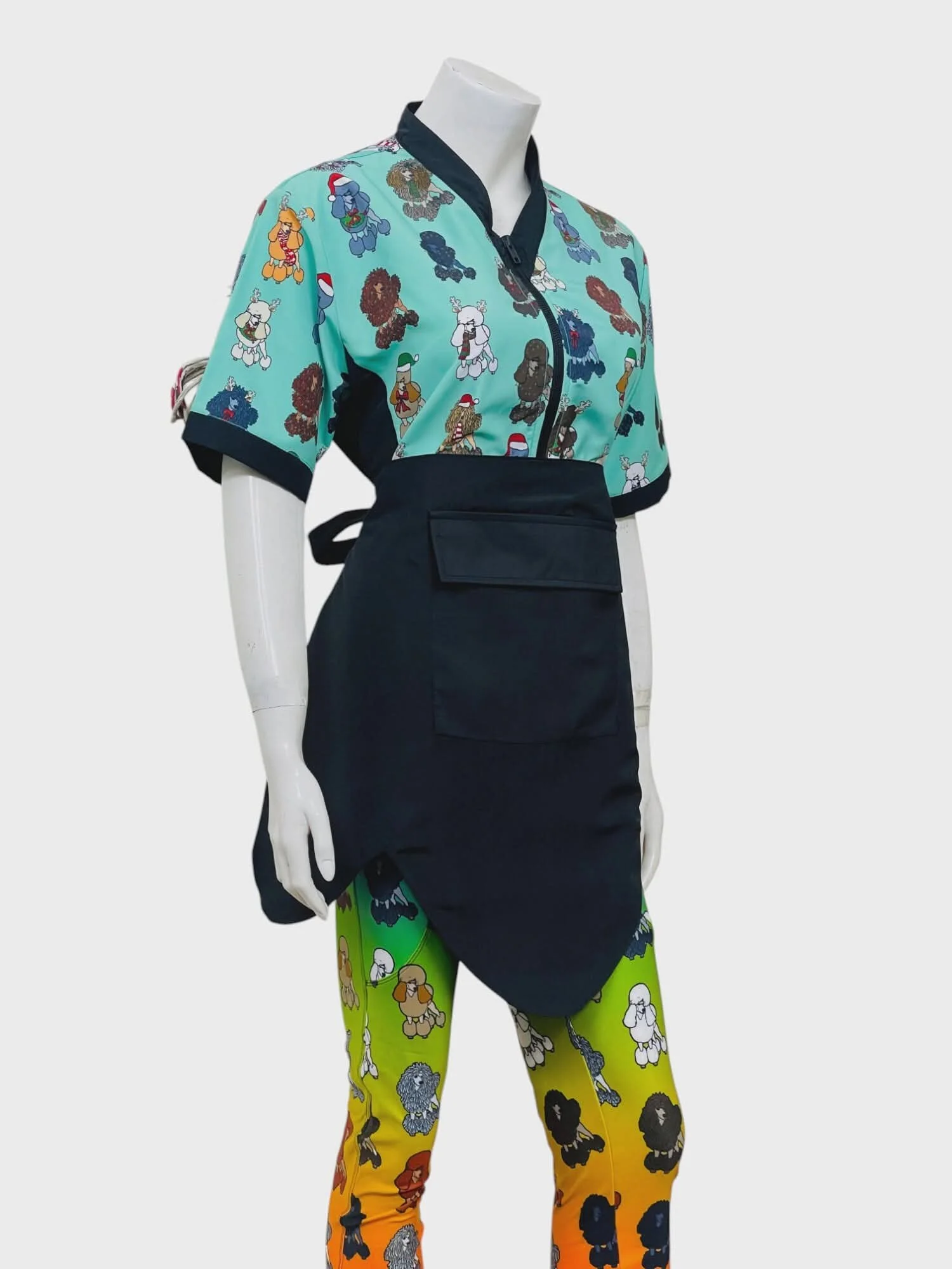 Super cute waist apron for dog grooming. Water and hair resistant. Perfect to protect your pants/ thighs from hair where you lean against the table. One front pocket with flap to keep the hair out and tie for behind your back..