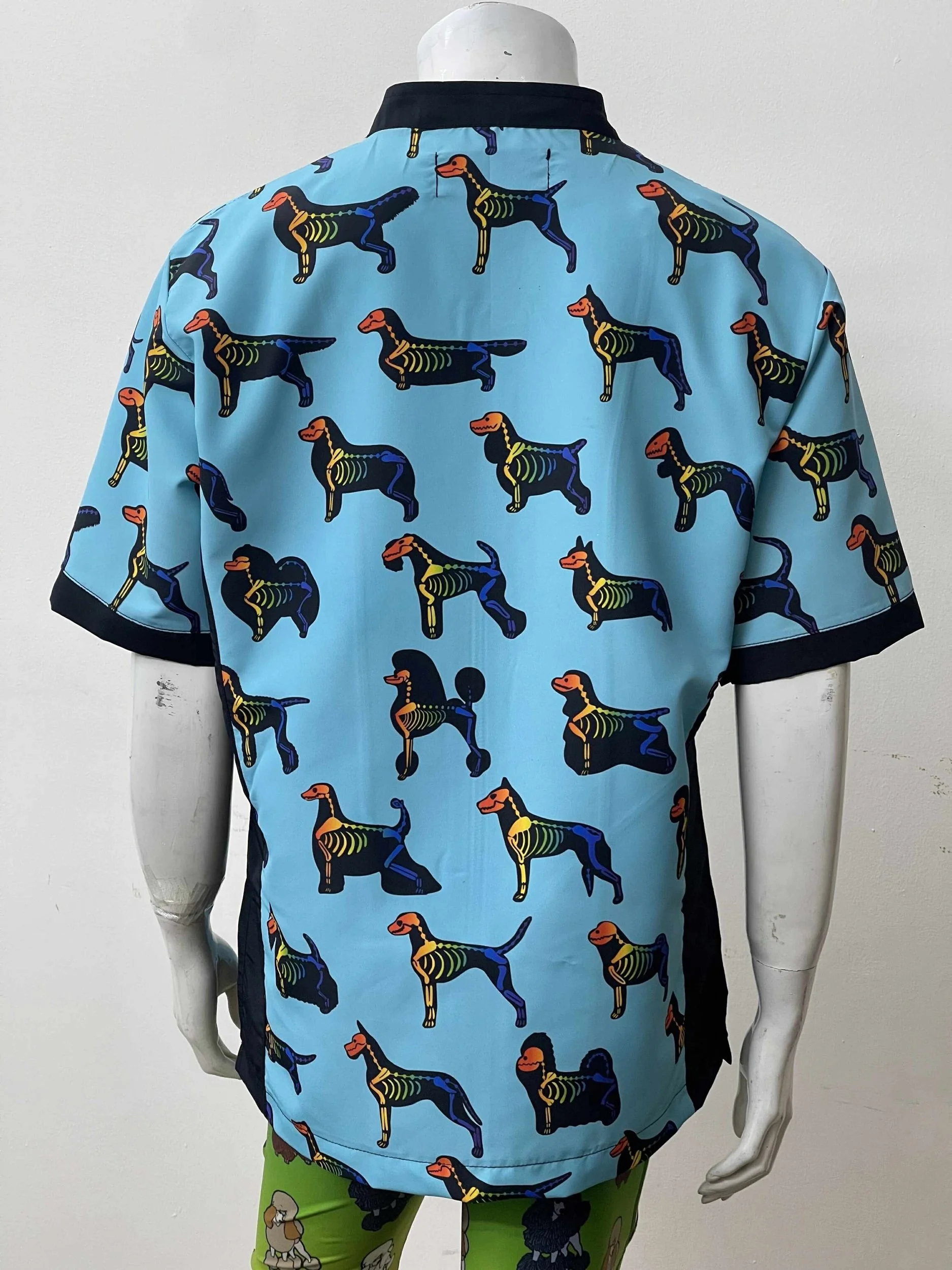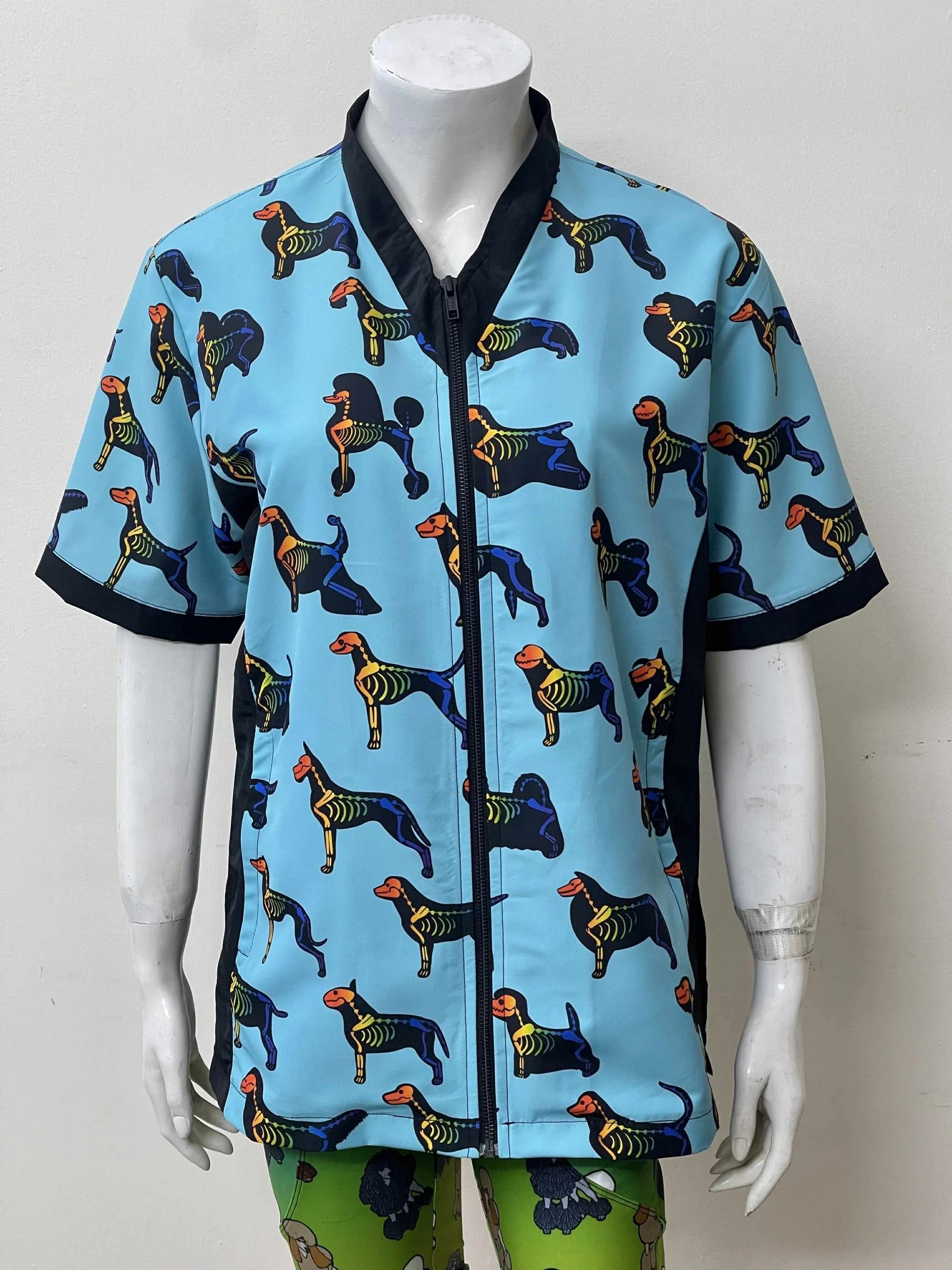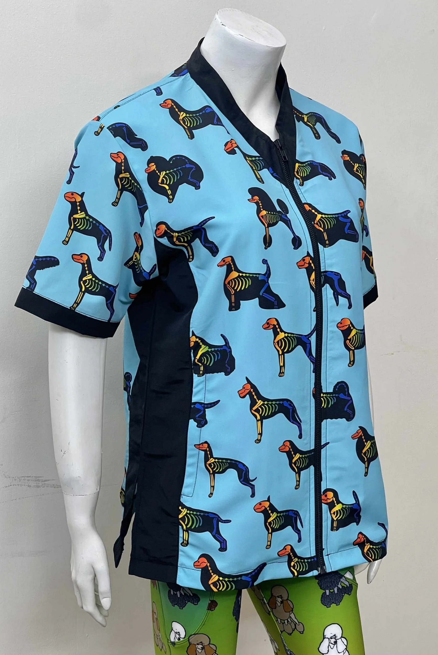 Turquoise blue smock with black trim, metal zippers, v neck, water and hair resistant material! With many different breeds artwork with rainbow skeletons!